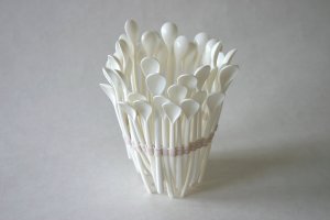 Jane Whitten’s basketry exists outside the genre’s established functional boundaries. My favourite from Canberra based Whitten’s recent Objectspace installation, Flight is composed of little more than a collection of plastic airline spoons woven into a small circular huddle with telephone wire. Flight embodies Whitten’s subtle found object approach to making. It is the self evident knowledge of aesthetic form and the ecological narrative in mass production which gives this unassuming and beautiful little work it’s conceptual gravitas. I love that this object, if it was to go on living in a domestic setting, would subtly remind me of all the permanent materials I’ve recently disposed of.