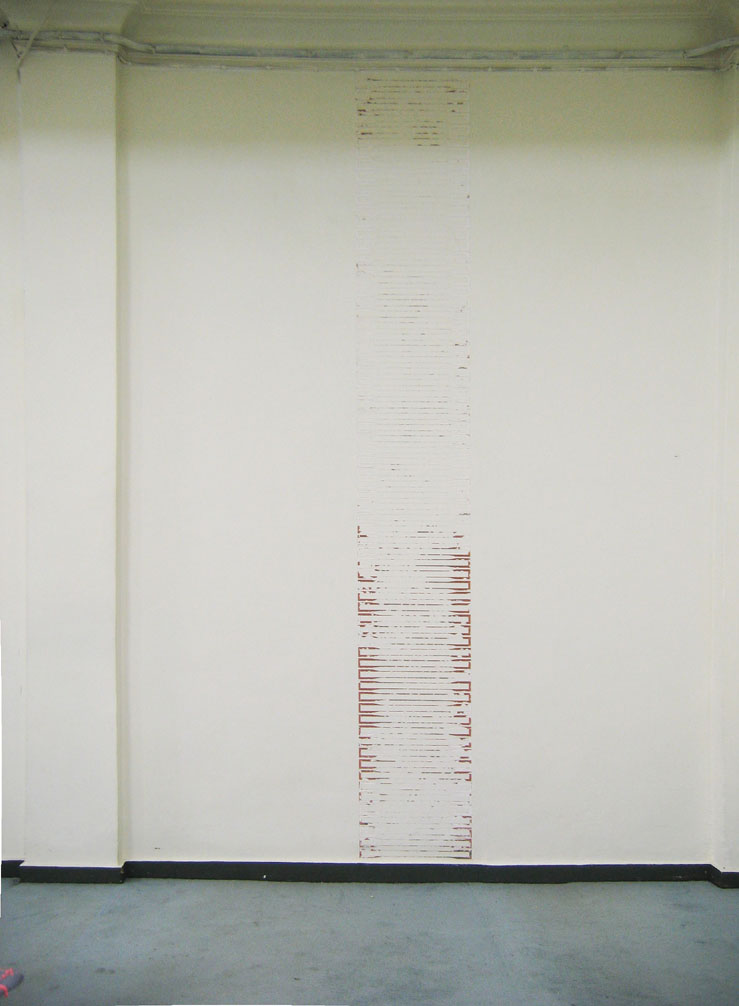 While not suggesting a criticism of this institutional framework, to the regular patron of an institution Lundberg’s work in a sense bridges the gap between the varying degrees of dialogism captured in an institution’s past exhibitions, and the currently popular souvenir-like live event. The process of skillfully marking and cutting the outline of a drawing then delicately removing strips of paint from the gallery wall uncovers stratified layers from previous exhibitions and often previous artists site specific wall works; all within a precise and site specific drawing. (3)