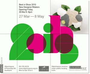 The following makers/designers/artists, recent graduates from art, craft and design programmes around New Zealand, were featured recently in Best in Show 2010 (27 March – 8 May 2010) that I curated and installed as part of my role at Objectspace. The above link has images and the below texts regarding each maker, as well as a link to a free PDF download of the print publication.